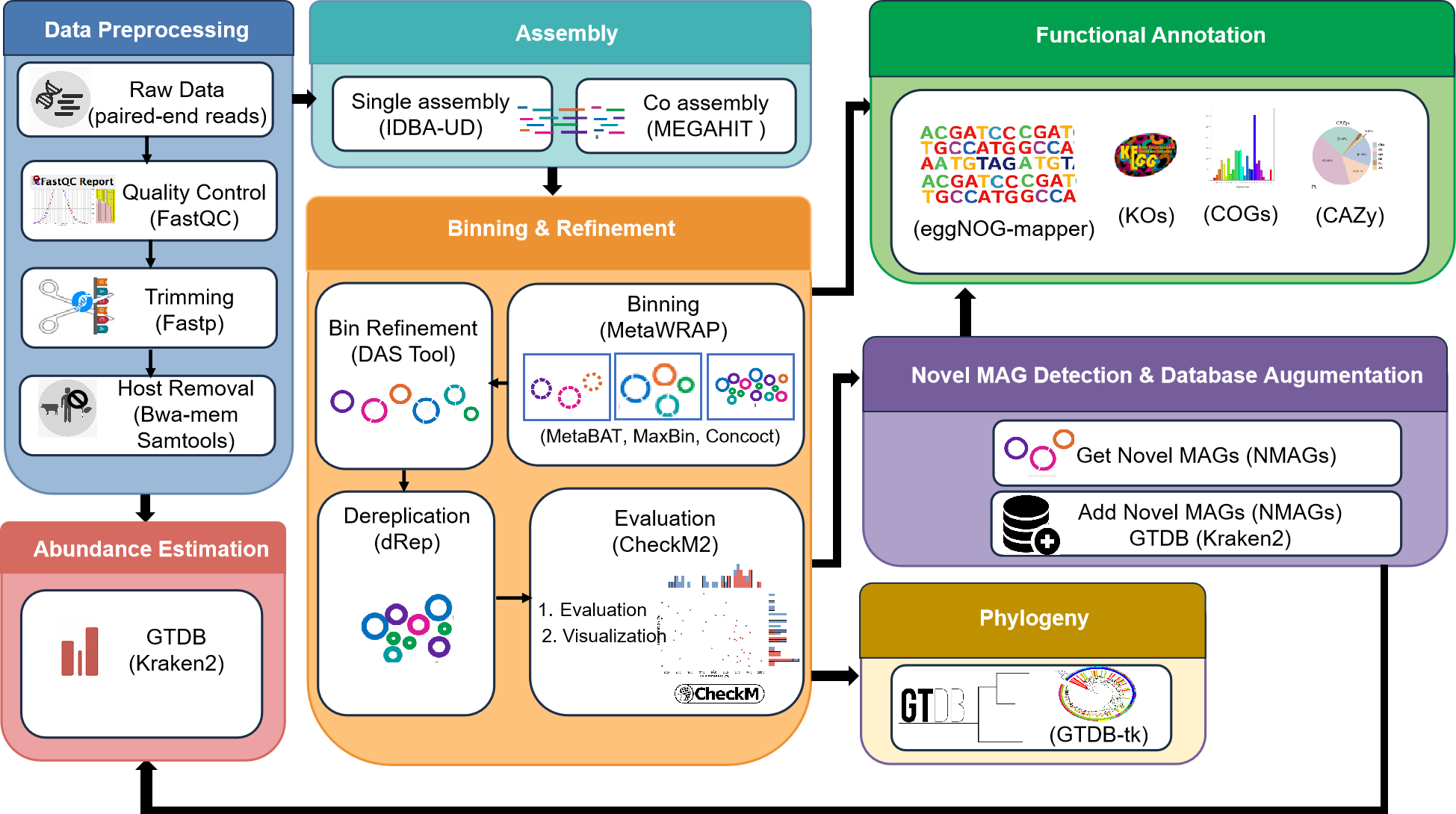MetaMAG Explorer is a comprehensive pipeline designed for the identification, processing, and analysis of Metagenome-Assembled Genomes (MAGs) from metagenomic data. This pipeline excels in detecting novel MAGs and integrating them into reference databases, with specialized handling for rumen microbiome data.
